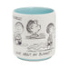 - Peanuts ceramic mug with glazed light blue interior and blue handle features gray year-dated drawings of Linus.