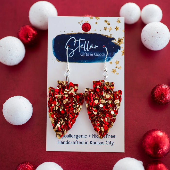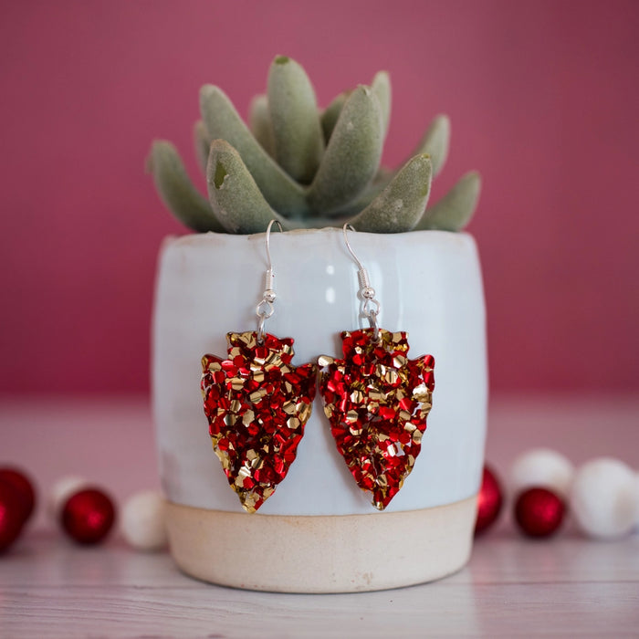 Medium Chunky Red and Gold Glitter Arrowhead Dangle Earrings