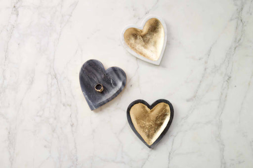 Mud PieGray heart shaped marble trinket dish with gold foil detail. Measures 5" x 5" Marble